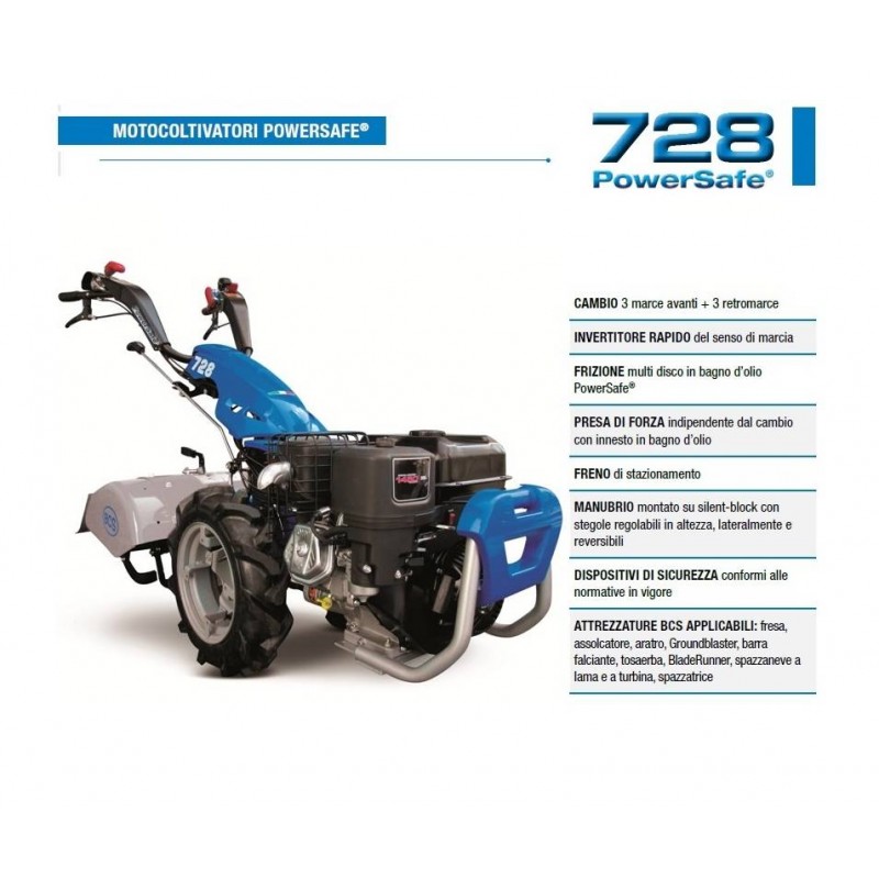 MOTOCOLTIVATORE POWERSAFE 728 , MOTORE HONDA GP160 BENZINA, CAMBIO 3 MARCE AVANTI + 3 RETROMARCE, INVERTITORE RAPIDO NEL SENSO DI MARCIA , FRIZIONE MULTIDISCO IN BAGNO D'OLIO POWERSAFE,STEGOLE REGOLABILI E REVERSIBILI CON MANUBRIO REGOLABILE IN ALTEZZA, PRESA DI FORZA INDIPENDENTE DAL CAMBIO CON INNESTO IN BAGNO D'OLIO,FRENO DI STAZIONAMENTO, LARGHEZZA LAVORO FRESA 52 CM , DISPOSITIVI DI SICUREZZA CONFORMI ALLE NORMATIVE IN VIGORE, ATREZZATURE BCS APPLICABILI