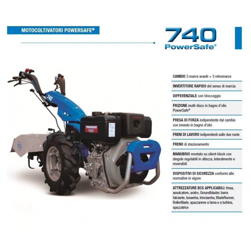 IL MOTOCOLTIVATORE BCS POWER SAFE ADOTTA UN CAMBIO CON 3 MARCE AVANTI E 3 RETROMARCE CON INVERTITORE RAPIDO NEL SENSO DI MARCIA. IL DIFFERENZIALE CON BLOCCAGGIO è DI SERIE. LE STEGOLE DI GUIDA SONO REGOLABILI E REVERSIBILI PER L'IMPIEGO DI ATTREZZATURE ANTERIORI E POSTERIORI. MONTA IL MOTORE KOKLER KD440 DIESEL , E' STATO CONCEPITO PER OTTIMIZZARE IL RAPPORTO QUALITA'-PREZZO, IL MOTOCOLTIVATORE 740 POWERSAFE HA LA VERSATILITA' LA DOTE PRINCIPALE CHE VALORIZZA IL PRODOTTO SIA PER IMPIEGHI NEL CAMPO AGRICOLO CHE IN QUELLO DELLA MANUTENZIONE DEL VERDE.ATTREZZATURE APPLICABILI BCS